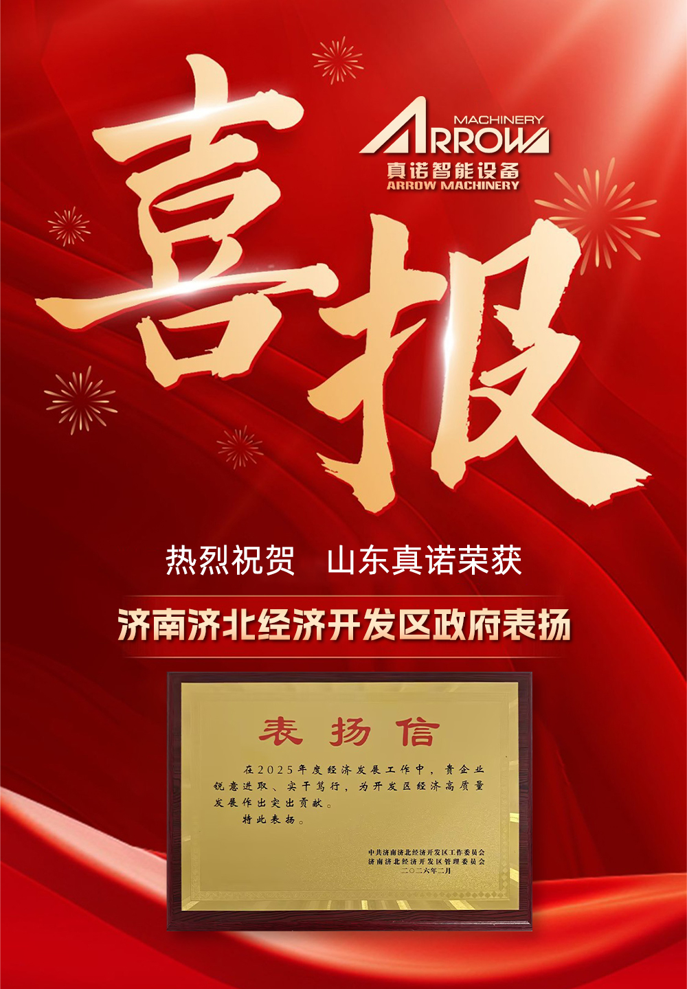 在济阳区“十五五开新局·2026建新功”工作动员大会上,山东真诺荣获济南济北经济开发区政府表扬。