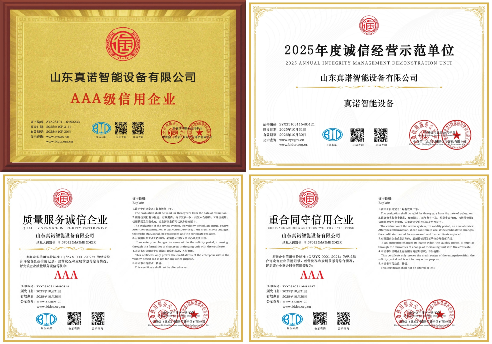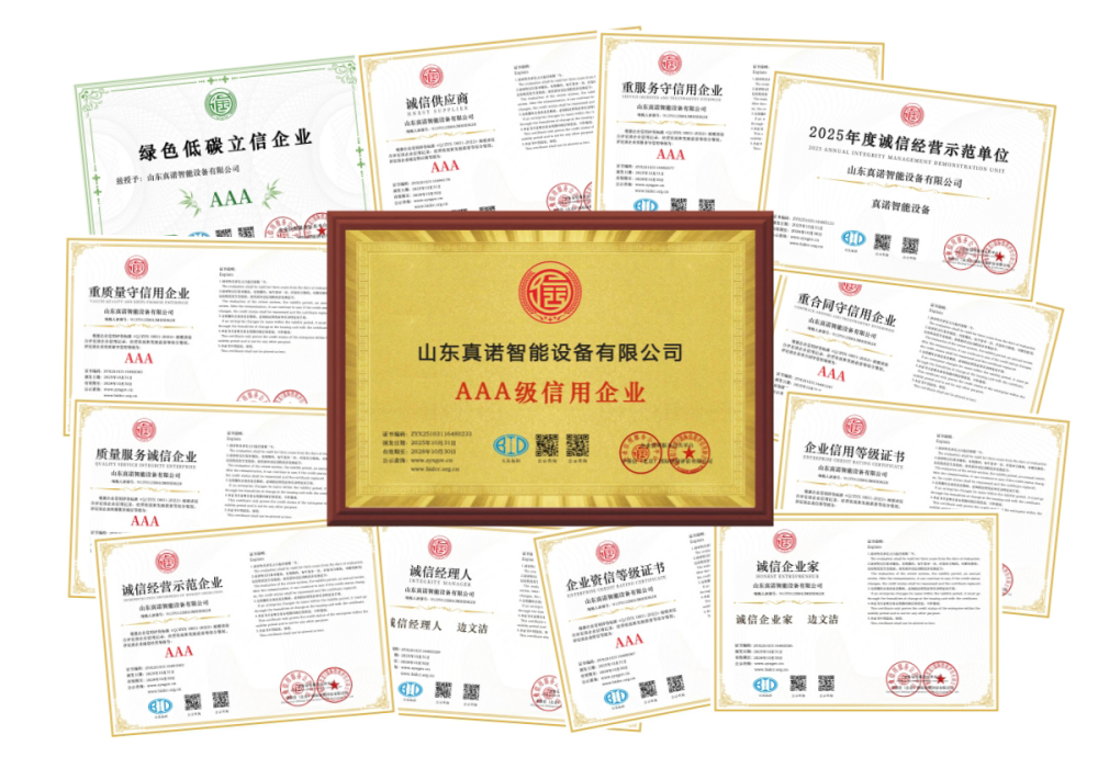 山东真诺智能设备有限公司始终将诚信作为企业发展的核心价值观。此次荣获的多项AAA级认证,涵盖了信用、质量、服务、合同履行等多个维度,包括AAA信用企业、AAA质量服务诚信企业、AAA重合同守信用企业等十余项荣誉。